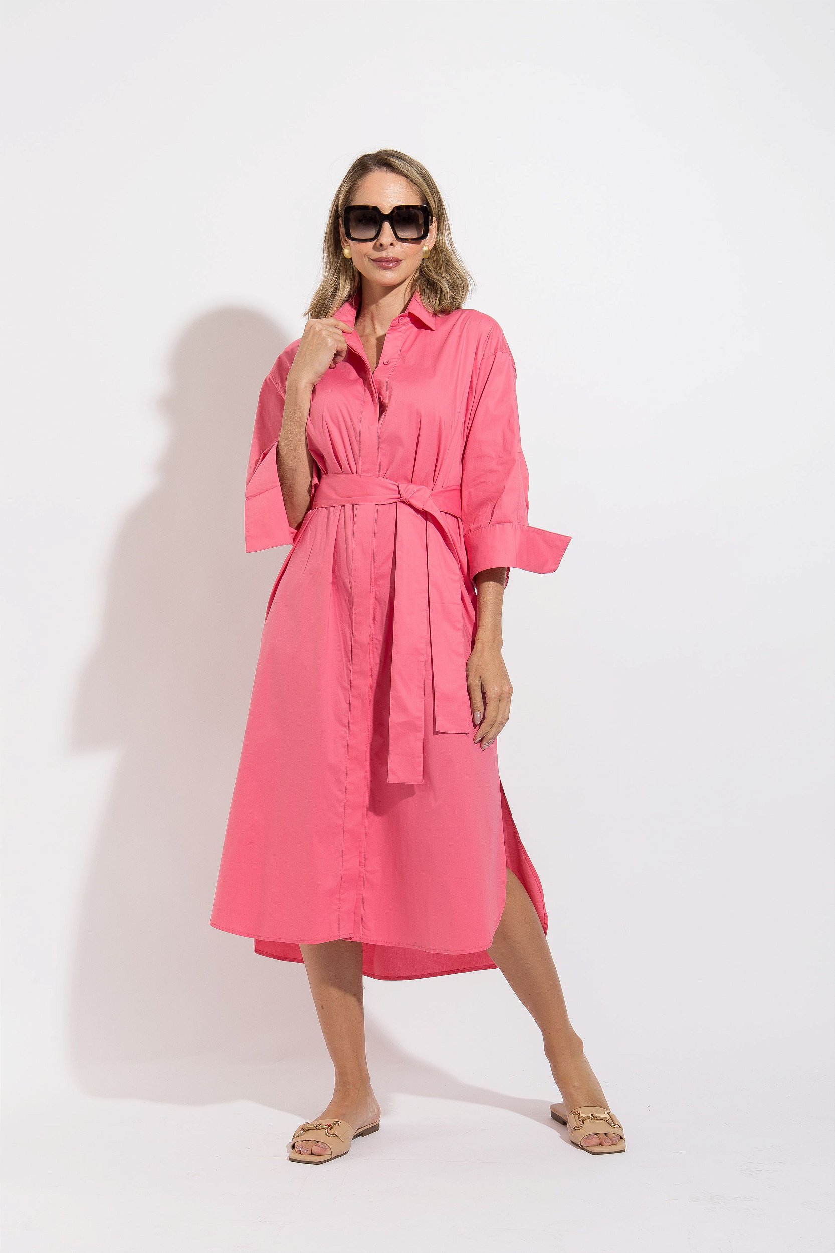 Vestido chemise na tricoline no belo tom de coral – modelagem confortável – o modelo sugere usar de diferentes formas – possibilitando interpretações pessoais – ótima sugestão para eventos diurnos.