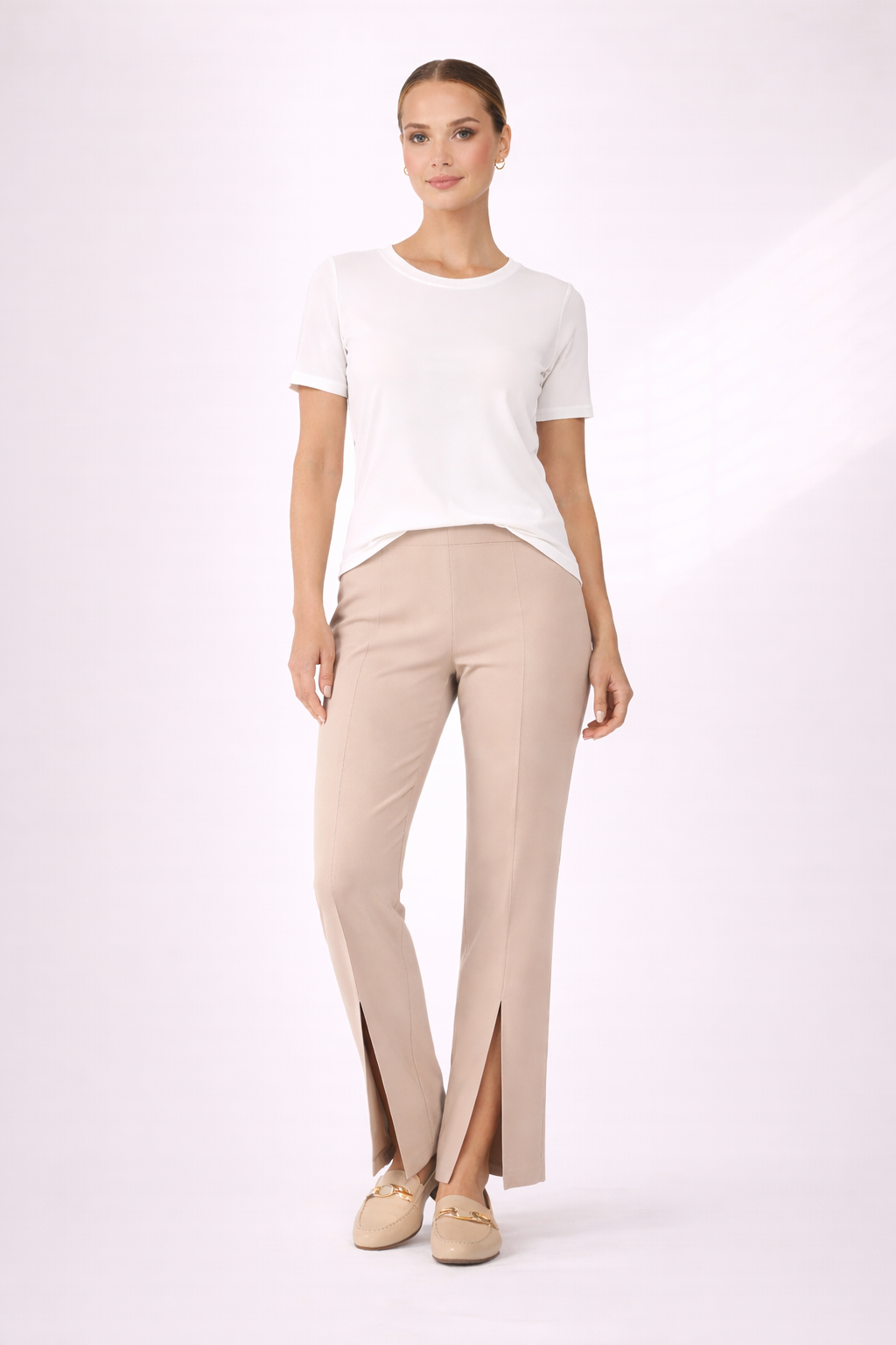Calça no crepe cor kaki com corte perfeito – nas pernas aberturas que completam o modelo com frescor e estilo.