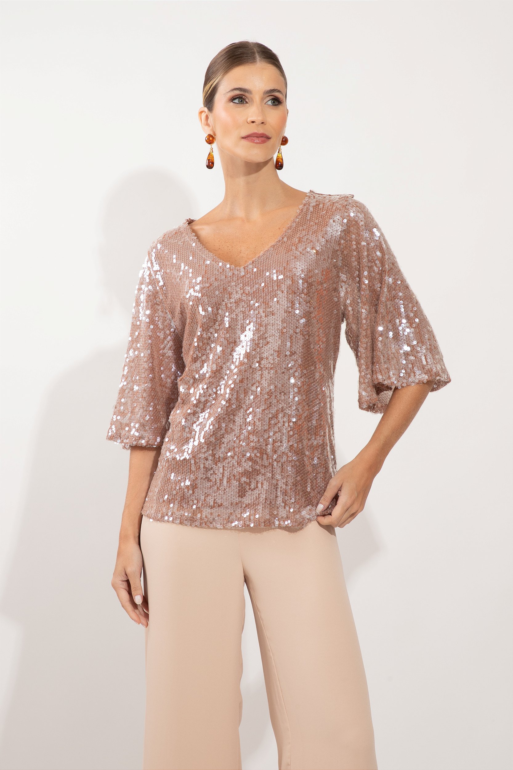 BLUSA DECOTE “V” COM MANGAS LEVEMENTE SOLTAS NO PAETÊ IMPORTADO FORRADO