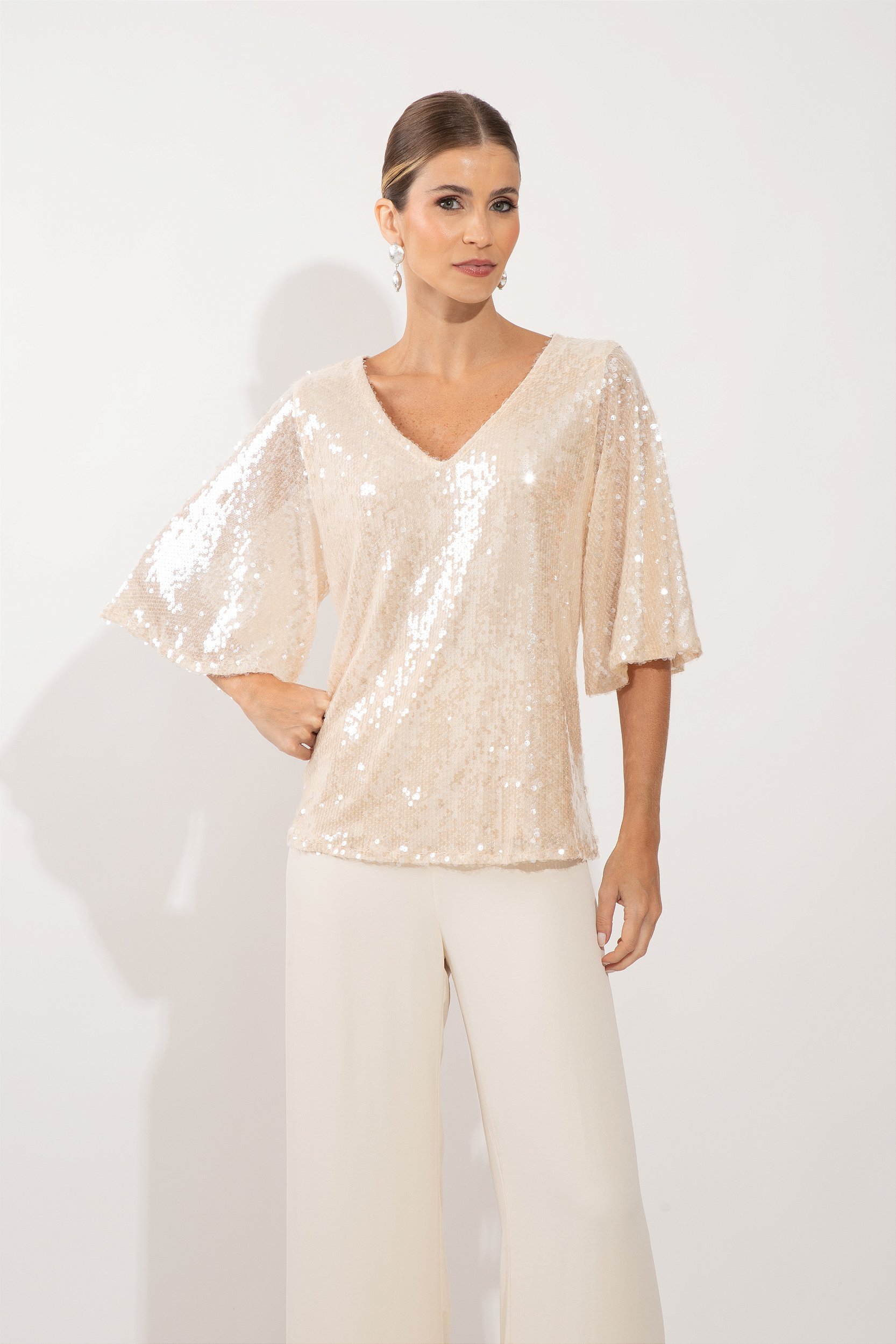 BLUSA DECOTE “V” COM MANGAS LEVEMENTE SOLTAS NO PAETÊ IMPORTADO FORRADO