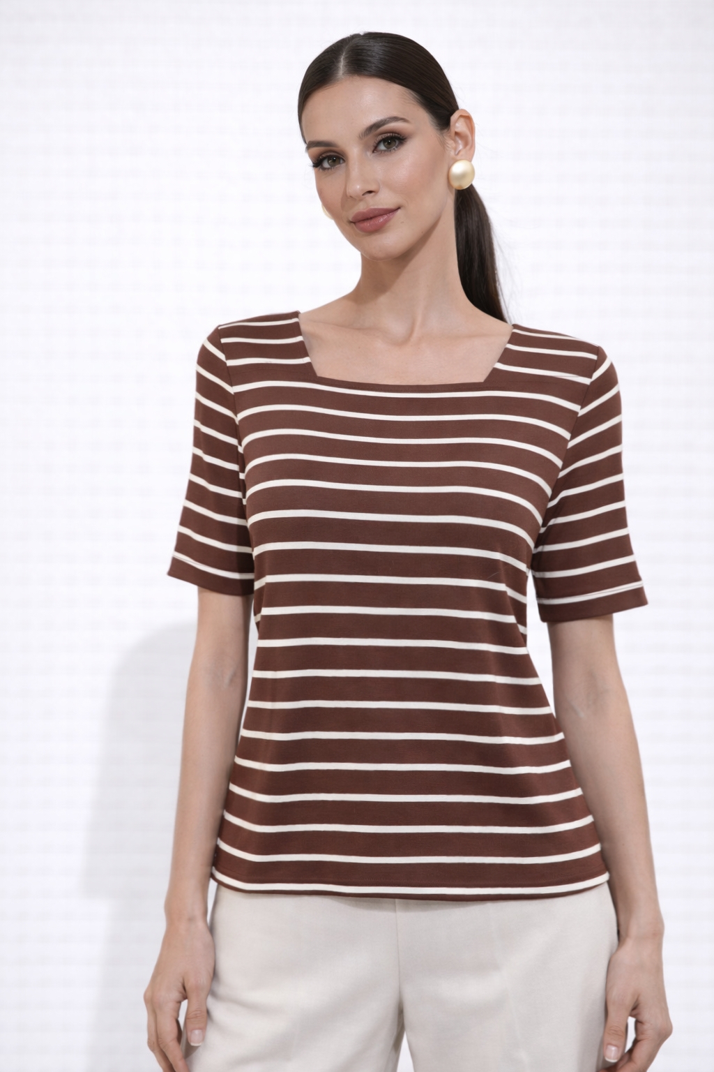 BLUSA NA MALHA DE VISCOCREPE NAS CORES : MARINHO E CAFÉ