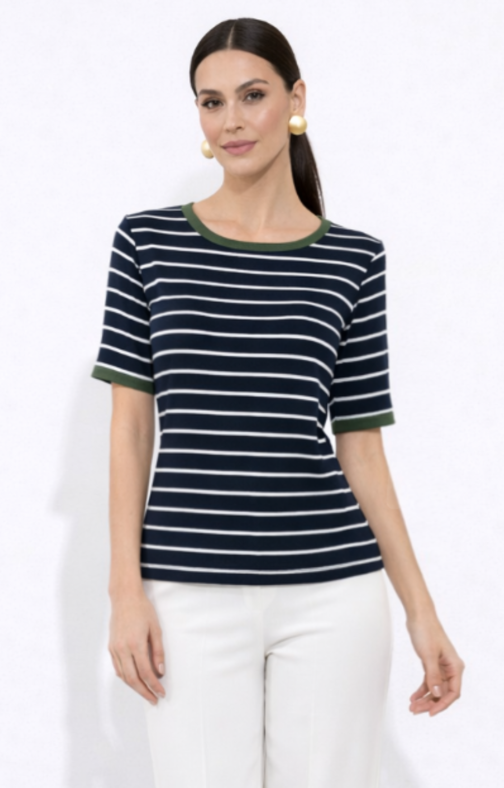 BLUSA COM CORTE LEVEMENTE RETO NAS CLASSICAS LISTRAS NAS OPÇÕES: PRETO E MARINHO E UM DIFERENCIAL: DEBRUNS NA MALHA LISA COR: VERDE MILITAR NA GOLA E MANGAS QUE FAZEM TODA A DIFERENCA