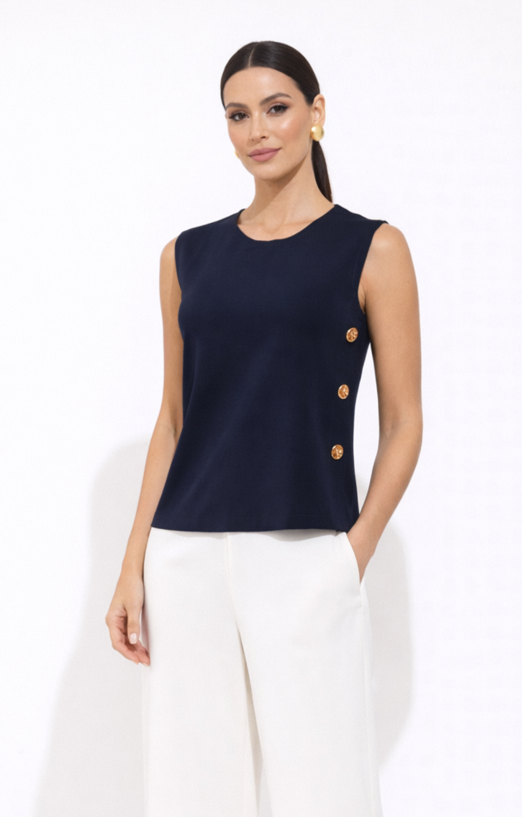 BLUSA NA MALHA DE CREPE SAINT TROPEZ COM BOTÕES DOURADOS NAS LATERAIS