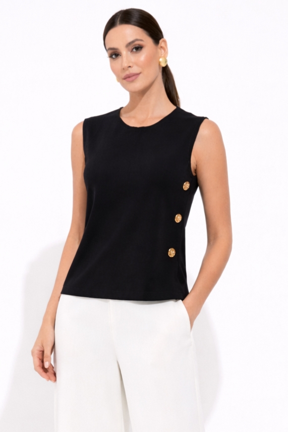 Malha de crepe Saint Tropez. Botões dourados nas laterais. Alças largas e corte semi reto. Fácil de usar e conservar. Ideal para festas de verão, confraternizações e eventos casuais.