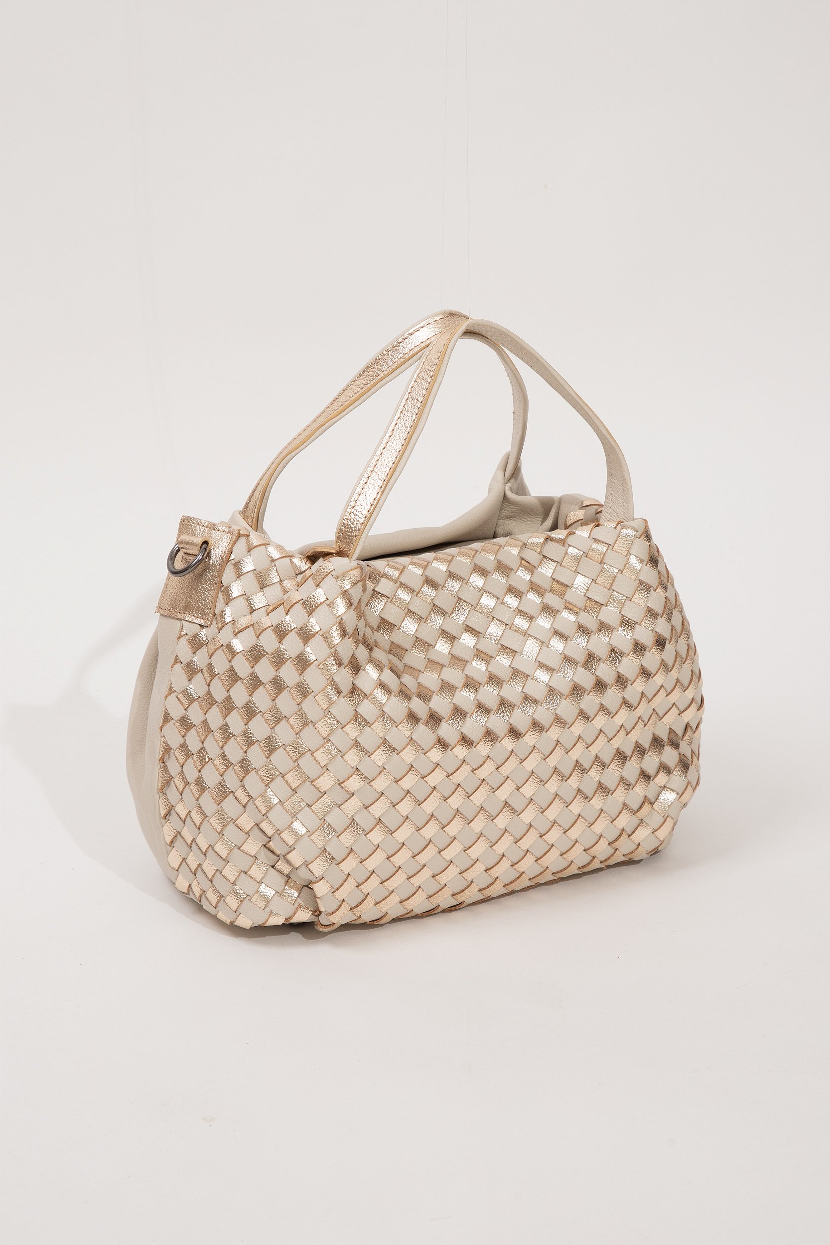 BOLSA EM COURO FLOATER ESTILO BAU NO TRESSE ( PARTE DA FRENTE ) NAS CORES : PRATA , OFF WHITE E BICOLOR