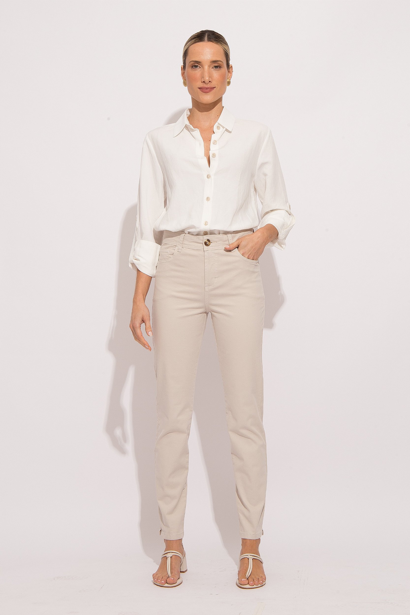 Calça modelo five pockets tipo cigarrete na sarja macia com elastano na cor areia – modelo best seller – presente em todas as coleções – modelo perfeito para o dia a dia, viagens e lazer.