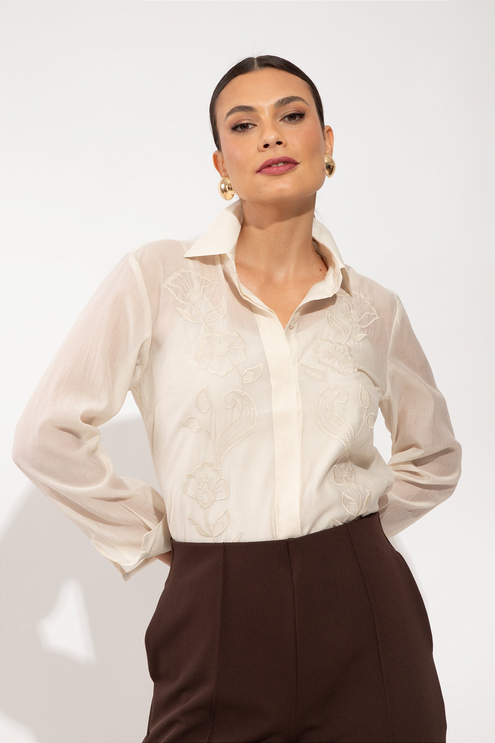 CAMISA NO GAZAR TOQUE DE SEDA COM BORDADOS APLICADOS
