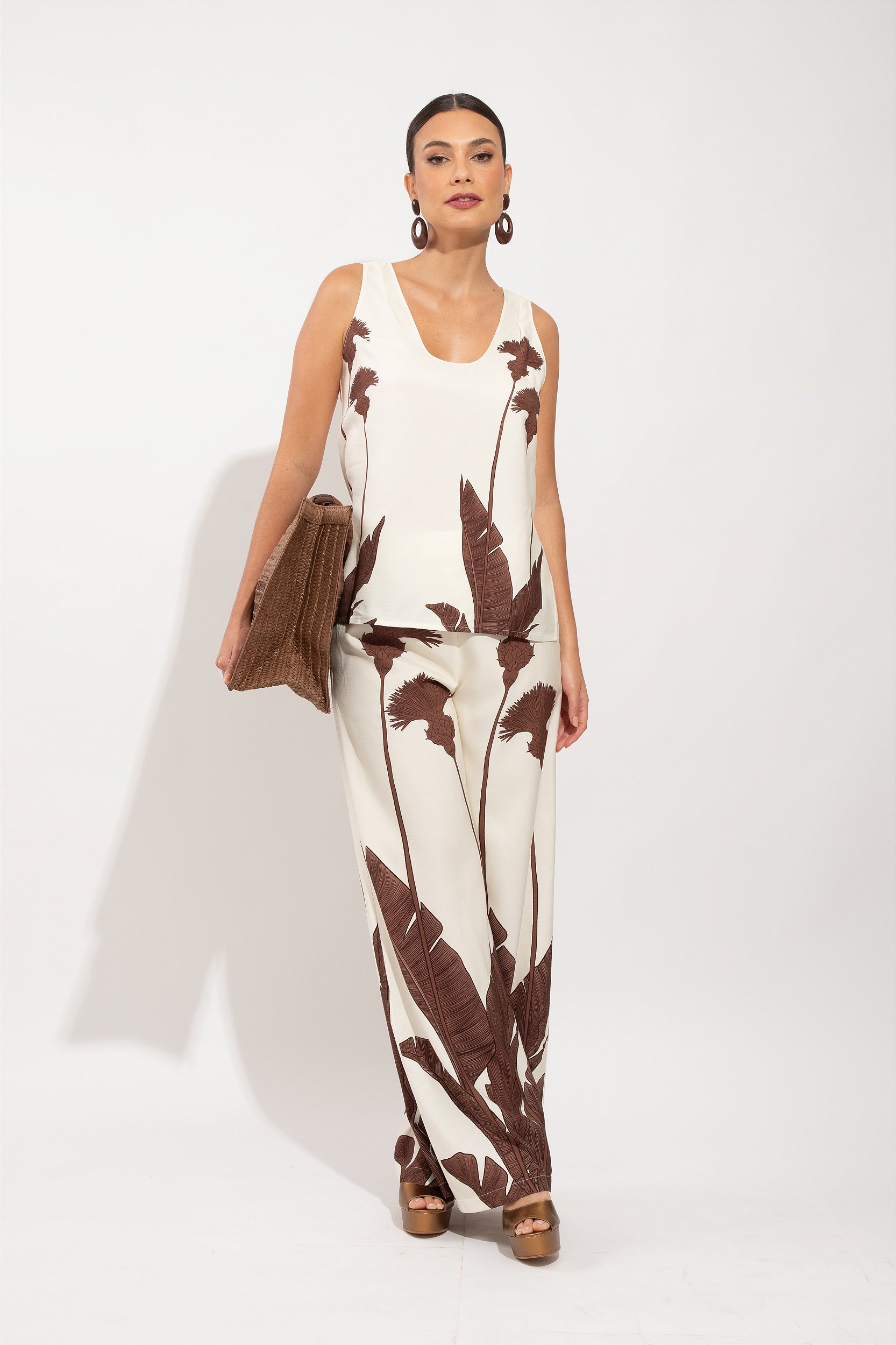 CONJUNTO COMPOSTO POR CALÇA ALFAITARIA E BLUSA REGATA NA VISCOSE IMPERAL COM ESTAMPA TEMA : BOTANIC NOS TONS DE CAFÉ – PROPOSTA SUPER CASUAL CHIC PERFEITA PARA OS EVENTOS DA ESTAÇÃO
