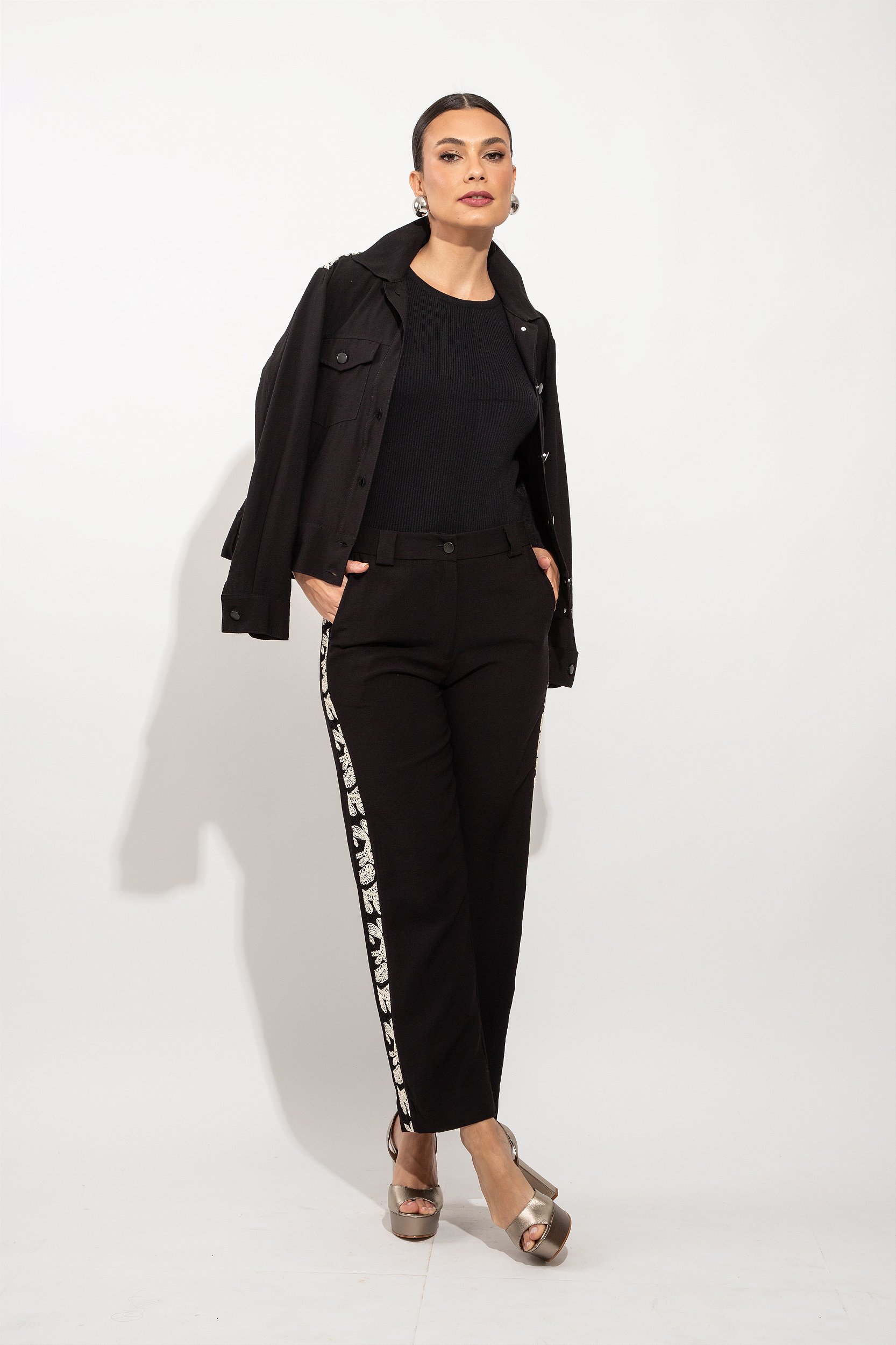 CONJUNTO COMPOSTO POR CALÇA E JAQUETA NA VISCOSE PREMIUN COM APLICAÇÕES BORDADOS NA COR OFF WHITE NAS COSTAS DA JAQUETA COM TRANSPARENCIAS E FRISO LATERAL NA CALÇA