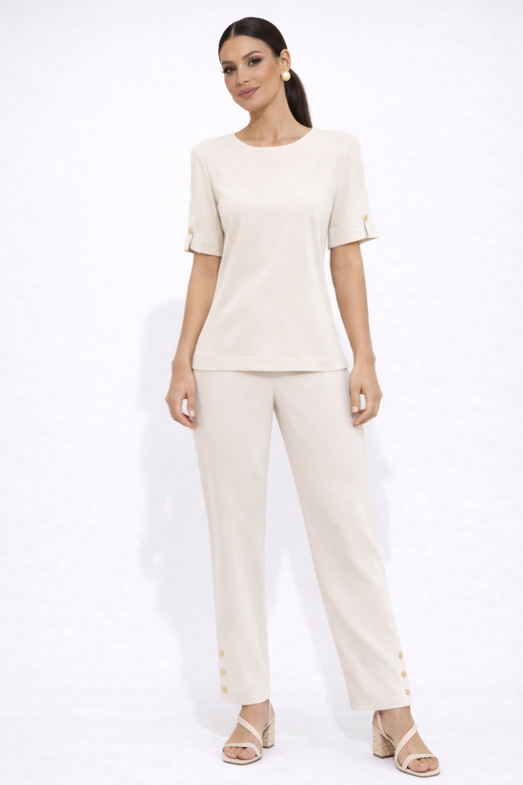 - A CALÇA COM ELASTICO SOMENTE NAS COSTAS RECEBE 03 BOTÕES DOURADOS COMO ACABENTO NAS PERNAS