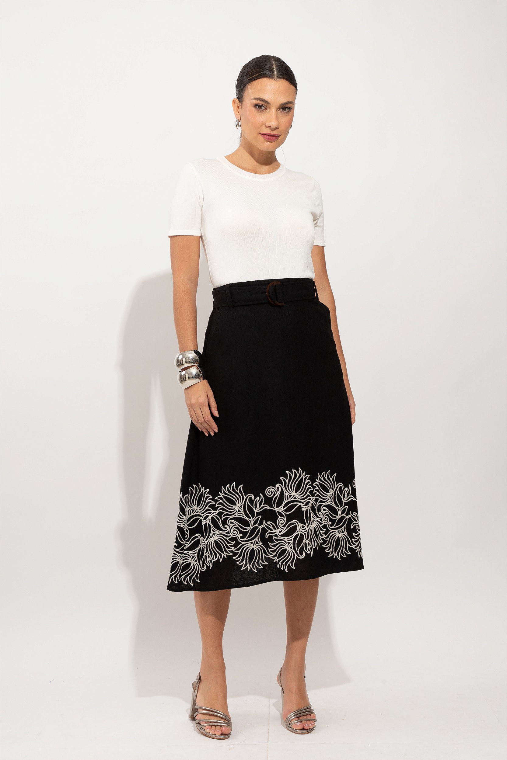 SAIA MIDI COM COMPRIMENTO ALONGADO NO LINHO PRETO E BORDADOS APLICADOS NA BARRA EM OFF WHITE