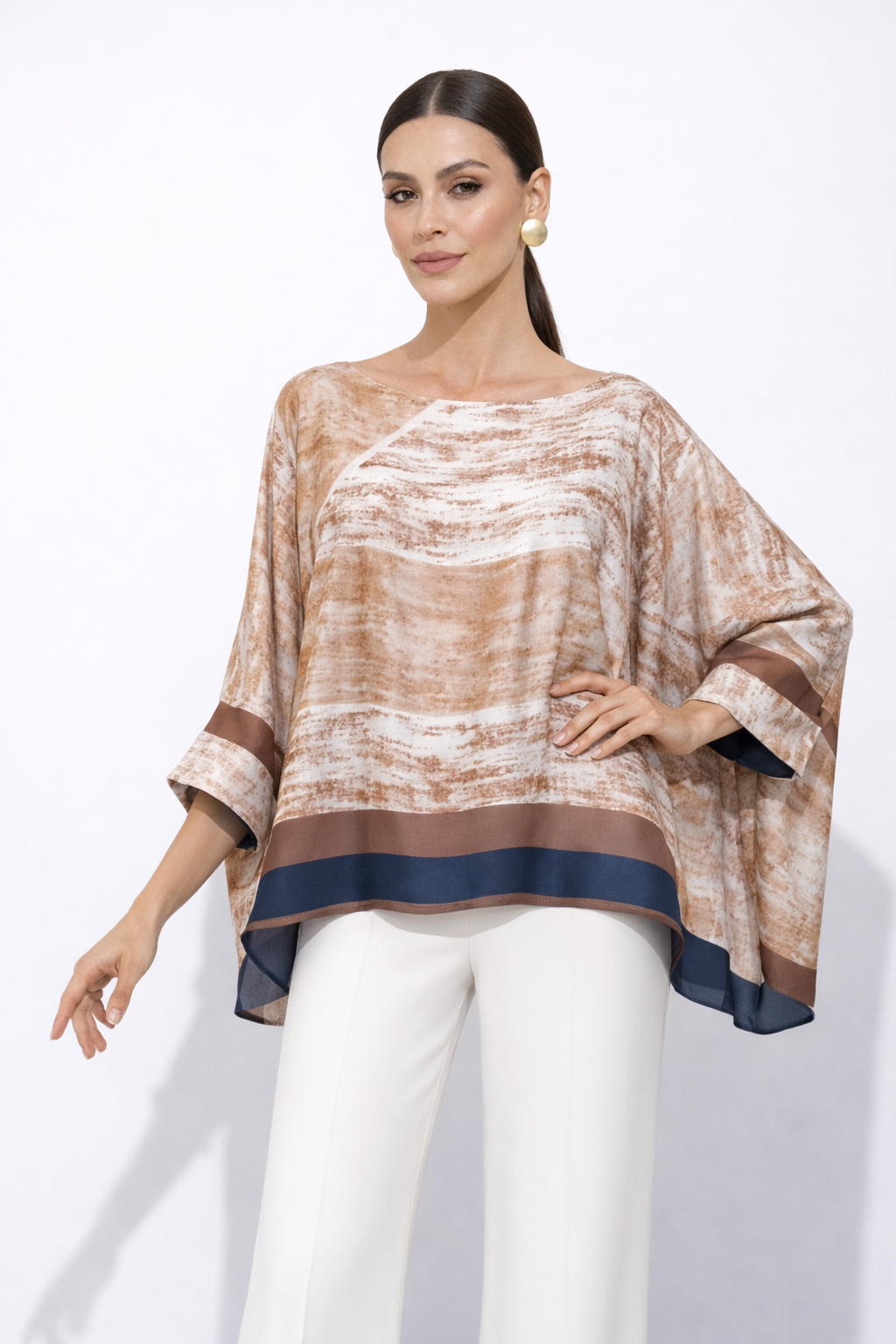 KAFTAN NO TECIDO TOQUE DE SEDA NA ESTAMPA “ MARMORIZADOS “ COM BARRADO NOS TONS DE :MARINHO, OFF. CAFE