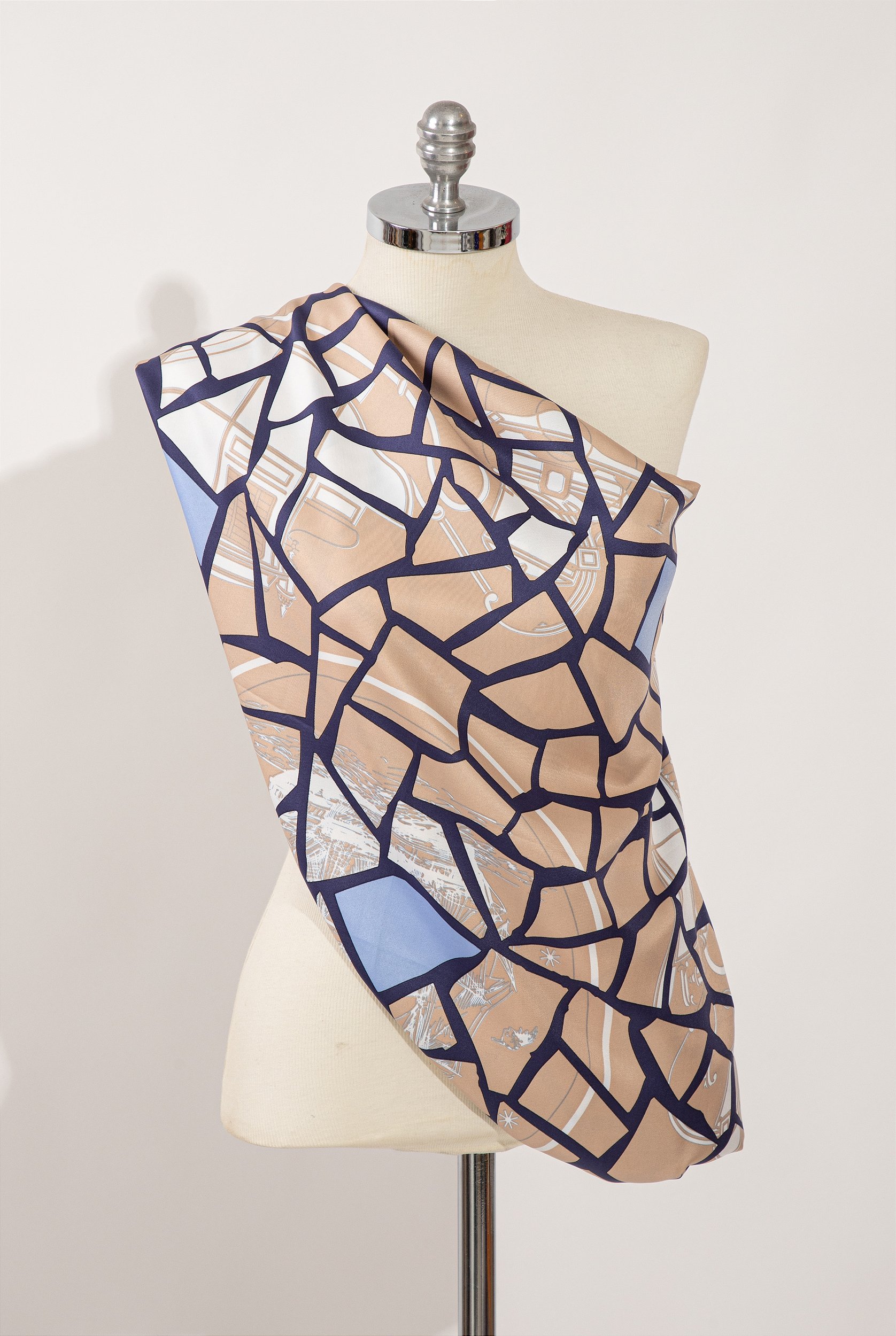 LENÇO NO TECIDO TOQUE DE SEDA, NA ESTAMPA “ AZULEJARIA “ AZUL E CAQUI, NA MEDIDA DE 90 CMX 90 CM
