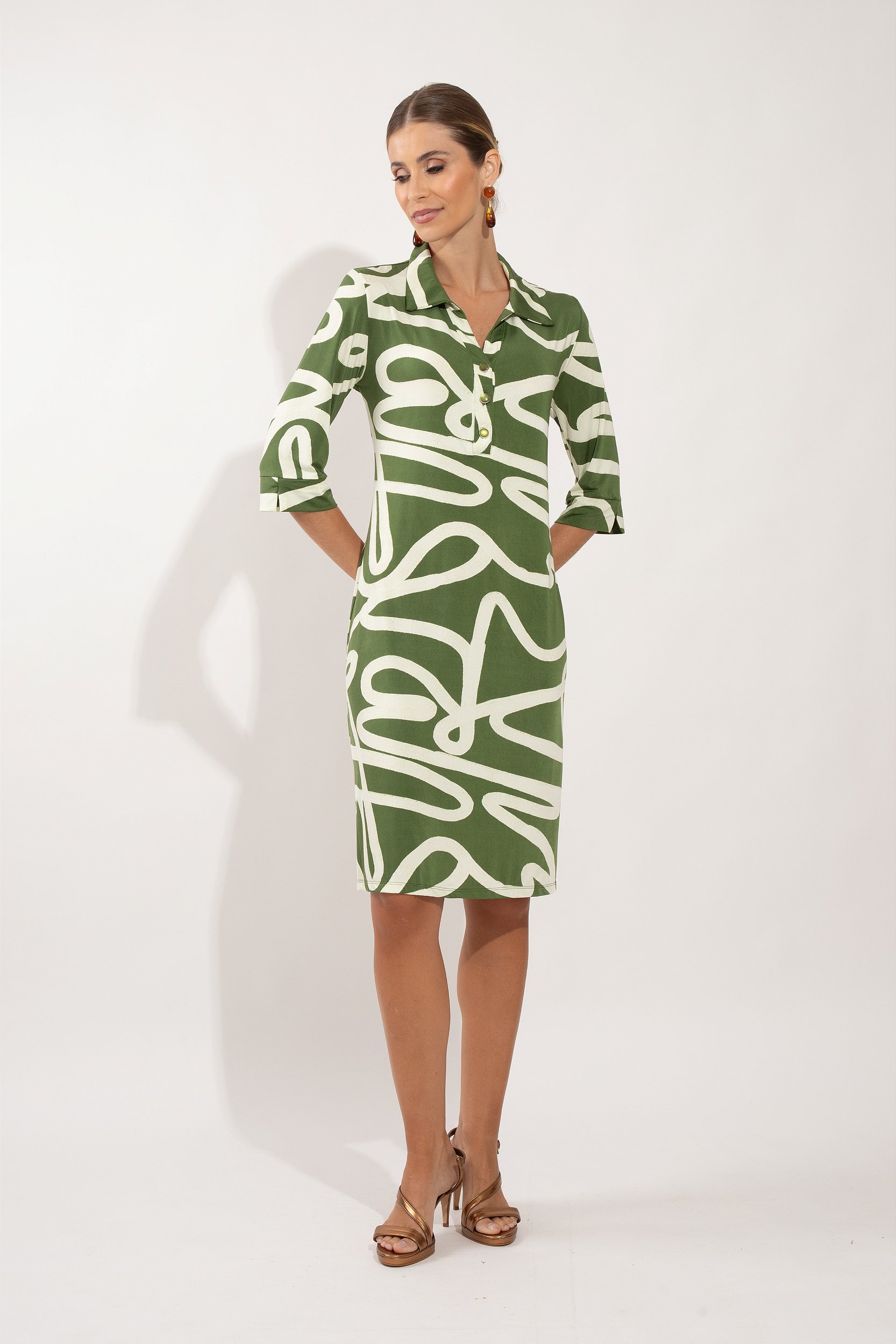 O Vestido Donna Verde une elegância clássica e modernidade. Confeccionado em jersey com estampa "Waves" nos tons de verde e off white, apresenta modelo estilo polo com corte semi reto que garante conforto e sofisticação. Clássico e atemporal, sempre elegante, é a escolha perfeita para quem busca versatilidade nas confraternizações e celebrações de fim de ano.