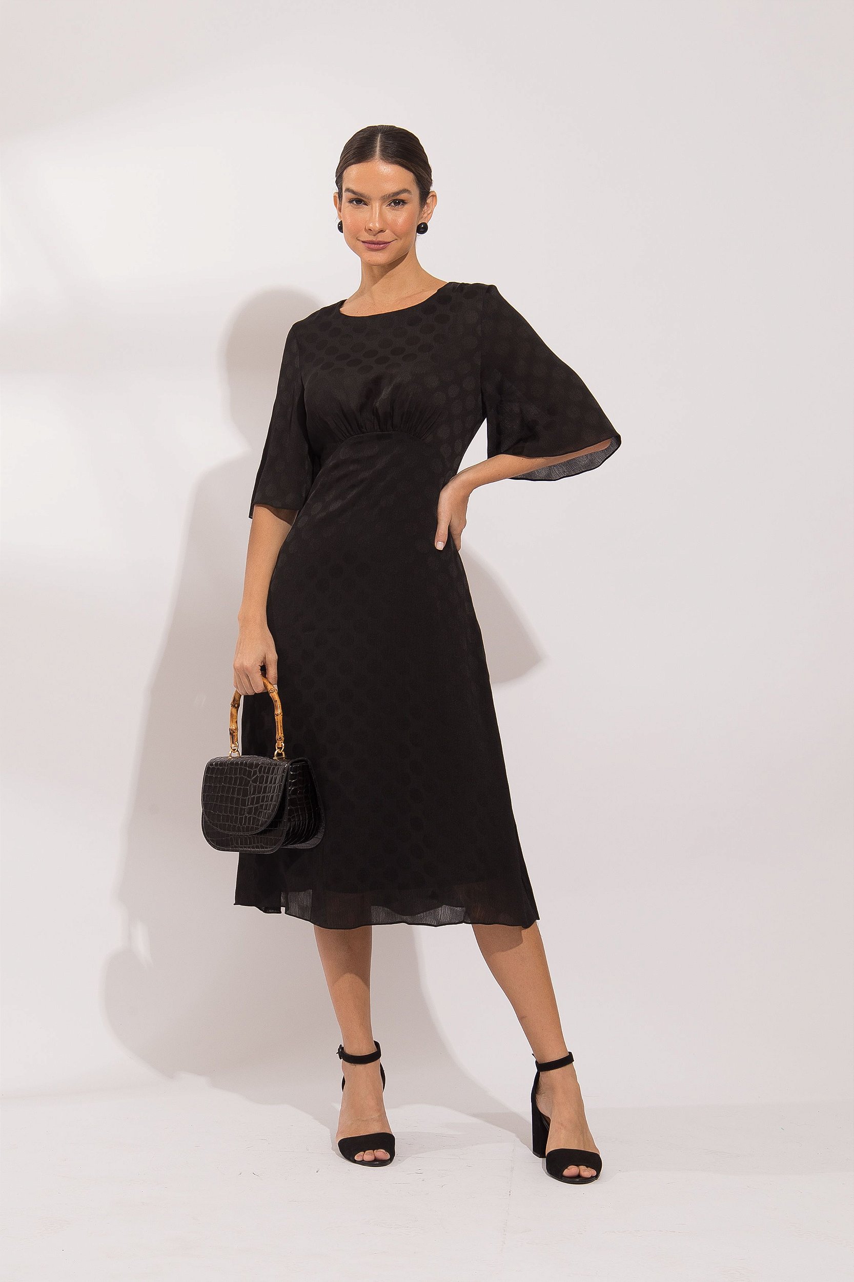 Vestido midi no tecido toque de seda com mangas levemente soltas – recorte após o busto com leves franzido – suave e feminino, perfeito para compor looks especiais de eventos – no poá em tons de preto – modelagem perfeita!